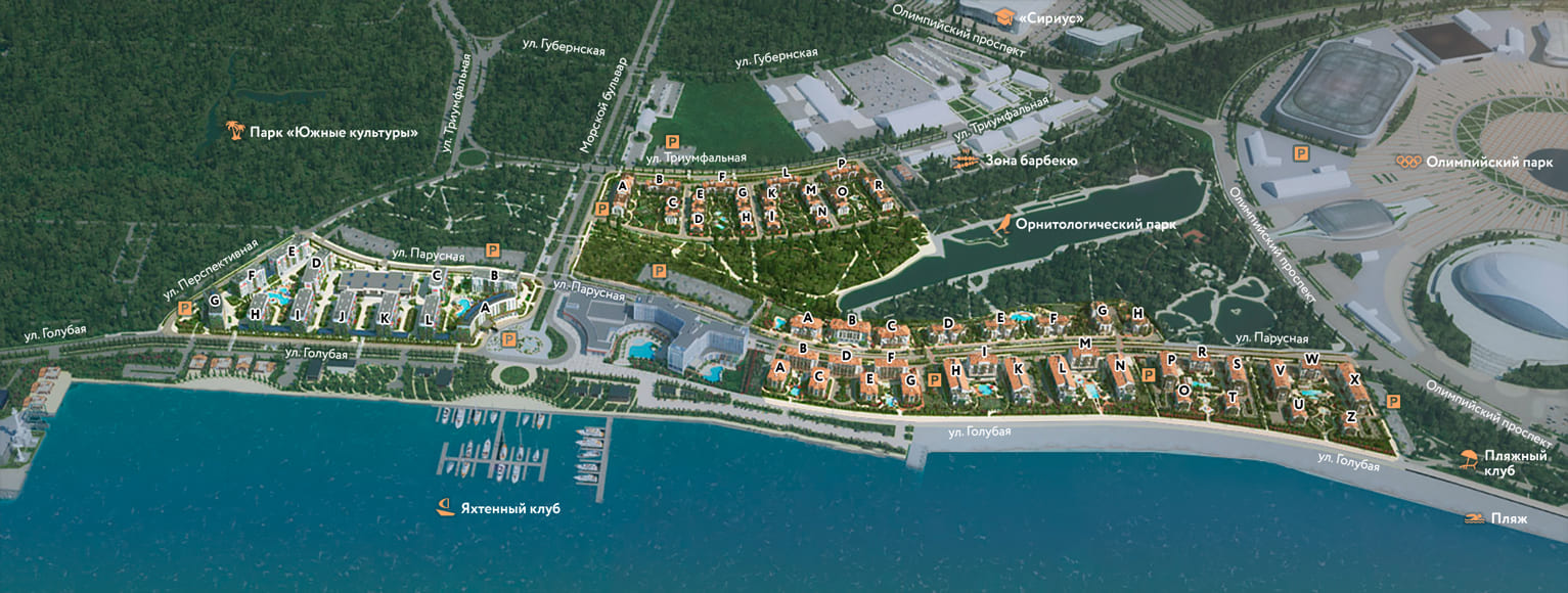 Основное отличие — кварталов – это расположение и удаленность от моря. Прибрежный квартал – с наиболее развитой инфраструктурой, Парковый – самый озелененный, Заповедный – тихий, Морской – ближайший к пляжу.